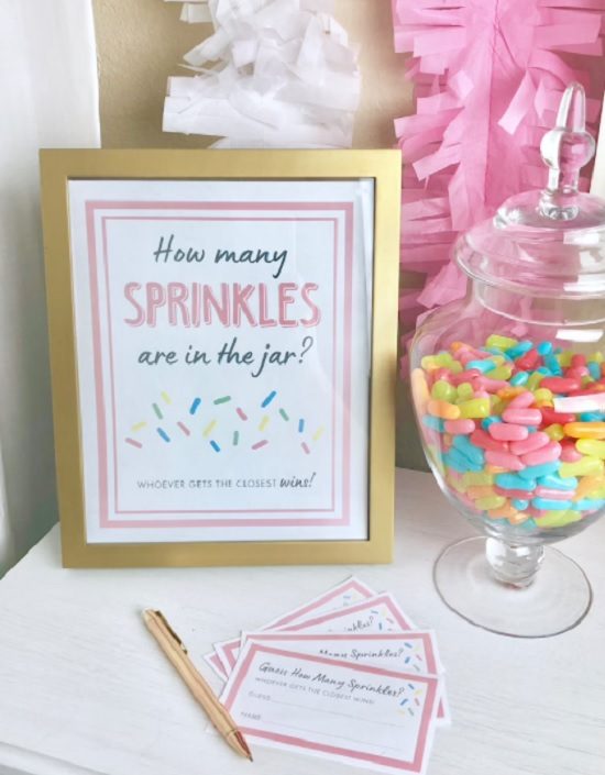 One of my favorite games to play for this theme is “How many sprinkles are in the Jar”, or guess the weight of the sprinkles in the jar. You could change it to a baby bottle if you’d like.