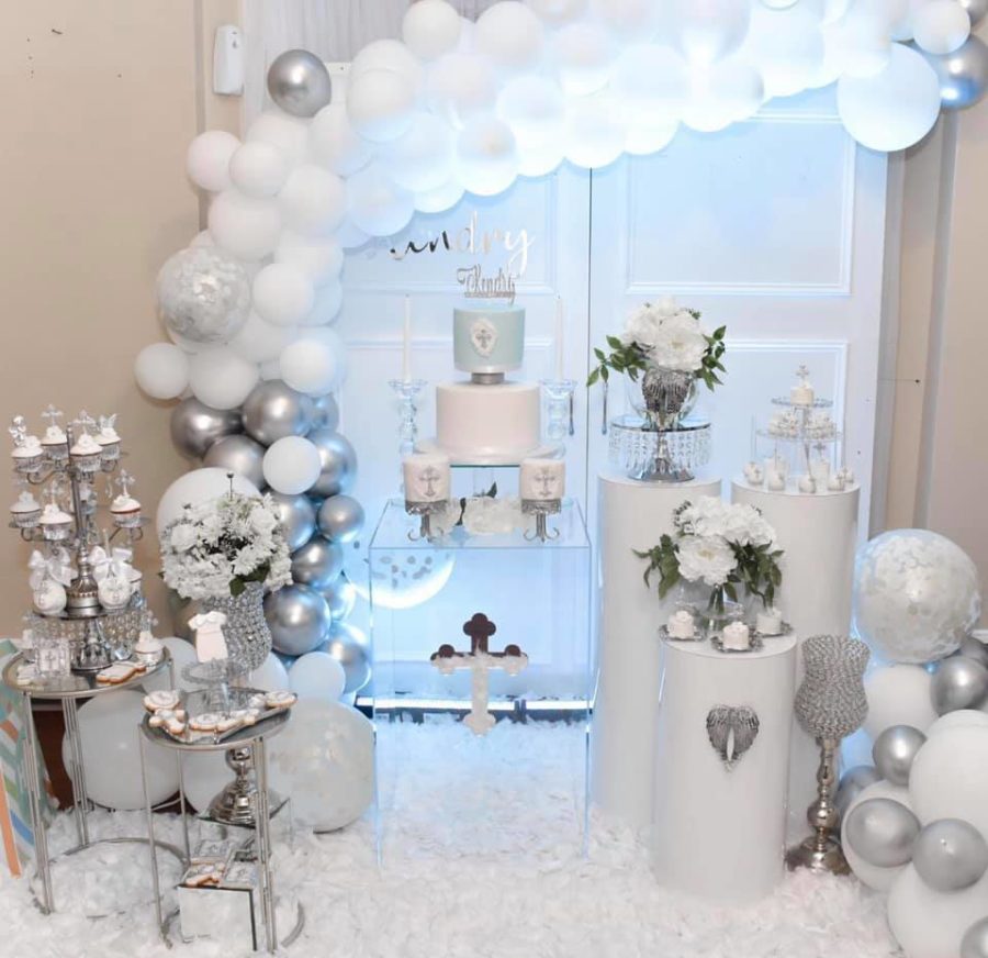 This blue and silver baptism was planned by Aura Decorations. The party was bursting with elegant decor! The dessert table