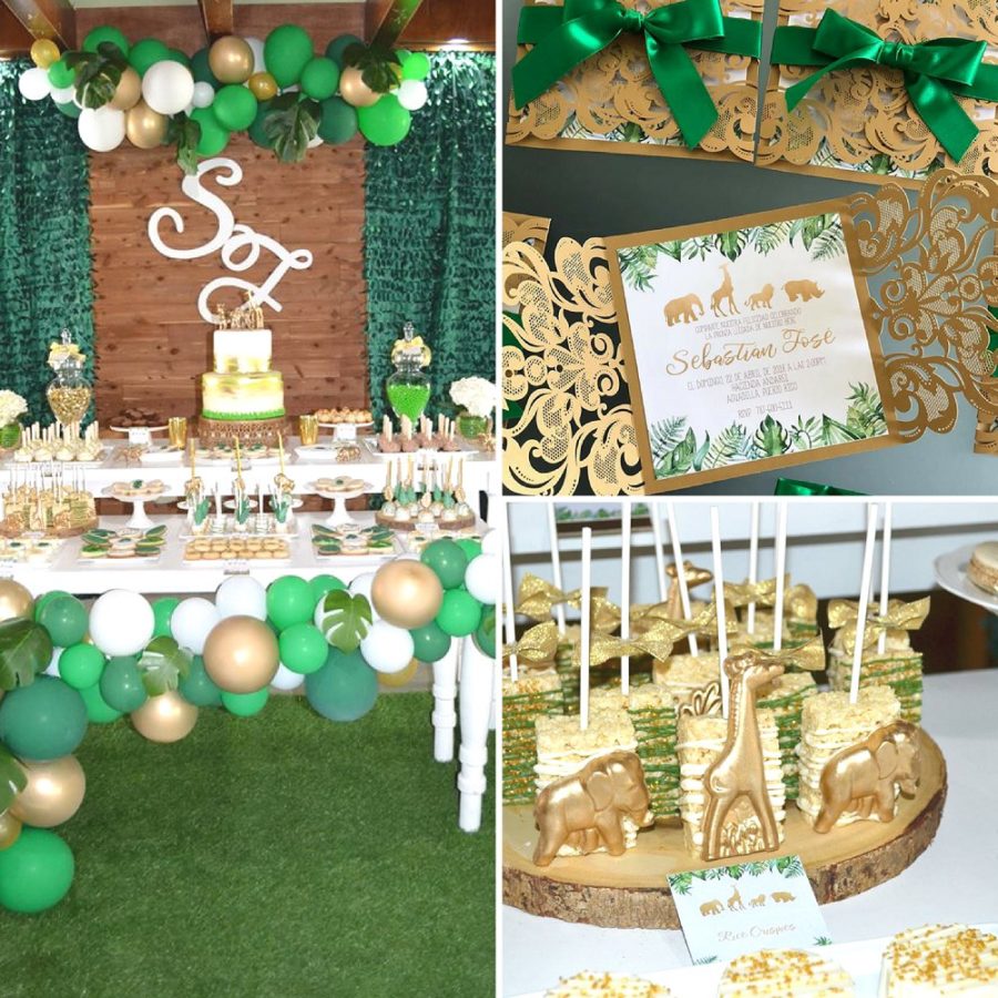 This spectacular gold and hunter green safari baby shower was styled is by Partylicious. Animals, palm leaves, and earthy tones