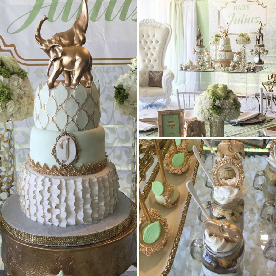 The smooth blend of white, green and gold colors gave this Golden Glam Safari Baby Shower themed event a sweet and