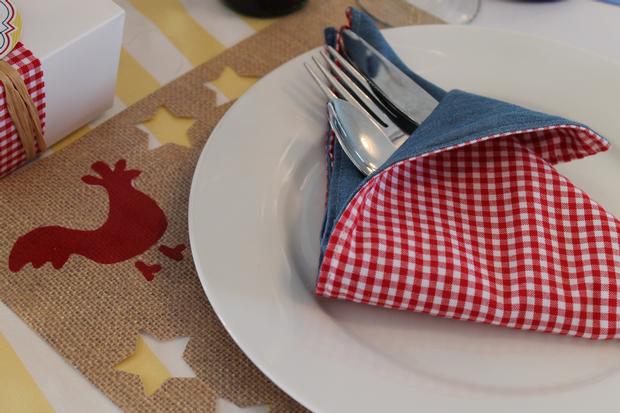 - Flower arrangement especially the bright red flower which stands out to match the red gingham fabrics used throughout the table setting