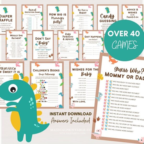 - Dino Baby Shower Bingo: Guests fill in bingo cards with potential baby-related gifts. As the mom-to-be opens her gifts, guests mark off items. The first one to get bingo wins.