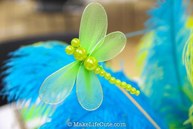 - Lime and blue feathers on dessert table as well as centerpiece on guest tables