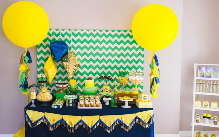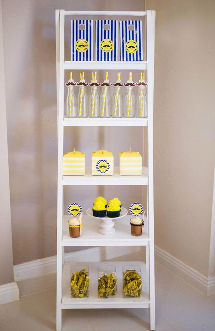 The theme of Neon, Geometric Mustache Bash is not the first thought that comes to your head for a party. Kudos!!!… To the genius of this perfect theme idea for a boy by Sarah of Sugar Coated Mama is such a professional and a mastermind of Sugar. This is definitely the grand start to a gentlemen’s affair. The mini mustache navy blue frosted cupcakes are the star on their own. The gold colored mustache it a cute and fun way to top a small cake. I don’t think you have a kid party without a piñata or a balloon but at this stylish event you can get both.