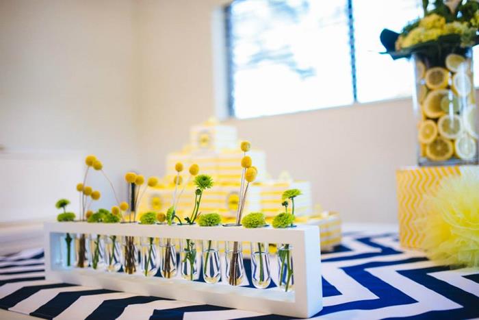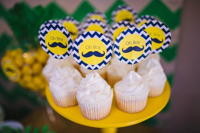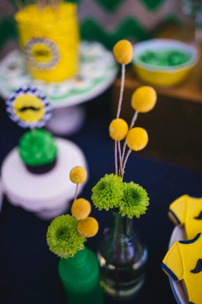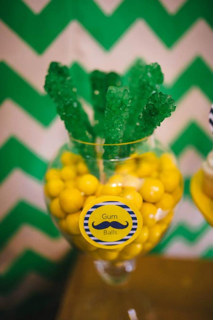 The backsplash of neon green has a psychedelic feel but it serves as a great center of focus for the treats that are available. The mustache tiers cake definitely looks the part of a young mans life. The pillars mimic the stages of adolescence. The baby yellow phase, the green childhood phase, to the age of unreason when the facial hair grows all give a cake like glimpse into what is to come. I think the flowers cannot go unmentioned at this shower because flowers are stereotypical to girls but in this masculine themed party, a flower fits in well. The lemon and lime give the flowers the fresh flair for the baby bouquets.