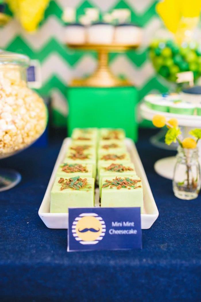 The gumballs and rock candy swizzle sticks cannot go unrecognized because they are perfect accents to the décor and theme. Just when you think the party is done the sophistication revels itself with the Mini Mint Cheesecake squares that are cleverly adorned and strategically placed next to another welcome surprise. What is a party without popcorn? Simple displayed the popcorn fits in perfectly like a band instrument for this mix-up of neon colors, geometric shapes, and mustache themed treats.