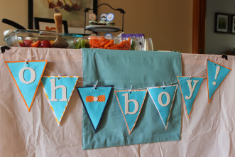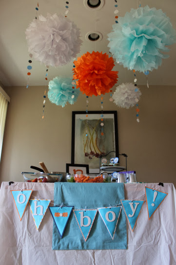 Jennifer’s baby shower was hosted by her sister, with a dashing little man baby shower theme with classy color scheme of baby blue, orange and white. Black moustaches along with phrase “oh boy” was featured throughout. The room was nicely decorated with garlands made of ties & little circles, and tissue paper pom poms hanging from the ceiling throughout the house. Food included cupcakes with very cute “oh boy” and mustache toppers, pumpkin pie trifles, and yummy snacks~ Thank you Jennifer for letting me share these lovely baby shower photos.