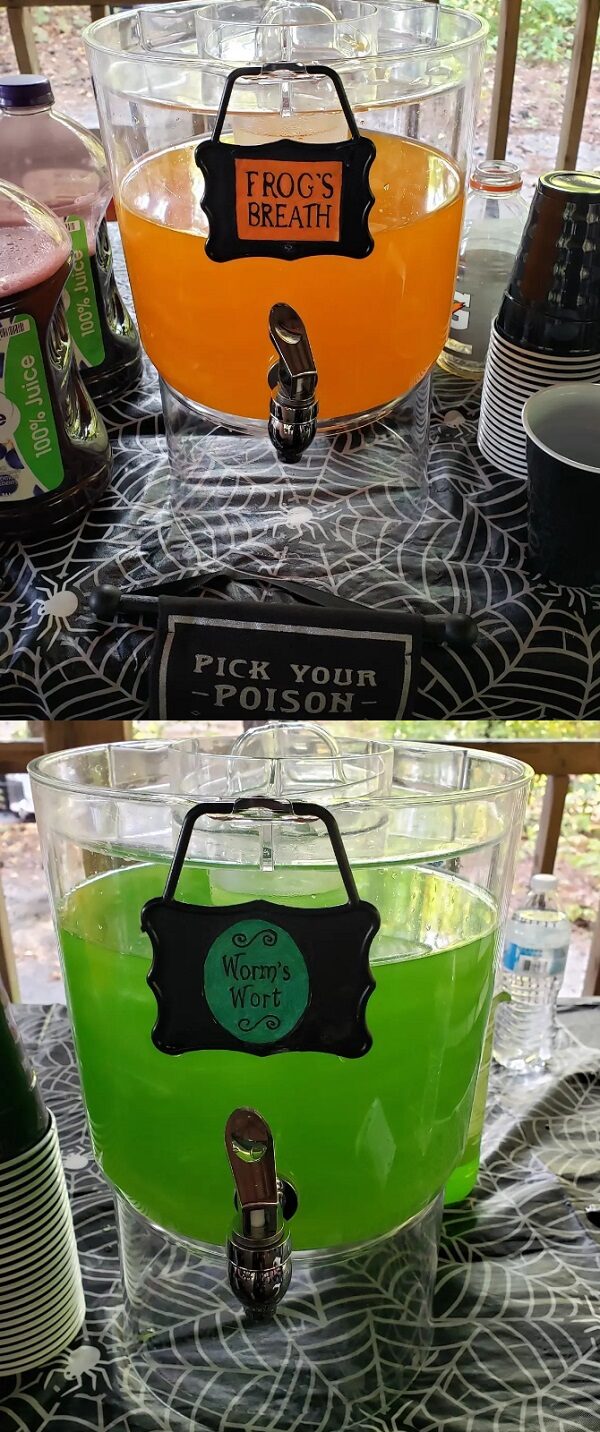 Drinks can include “Worm’s Wort Punch” (a green or purple punch with gummy worms), “Deadly Nightshade Mocktails” (a dark, fruity drink), and hot chocolate with themed stirrers or marshmallows shaped like characters from the movie.