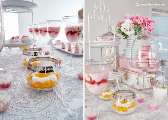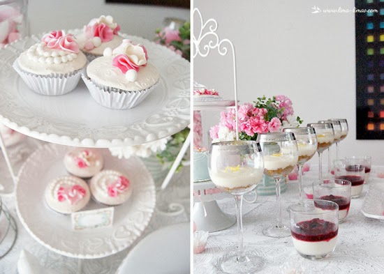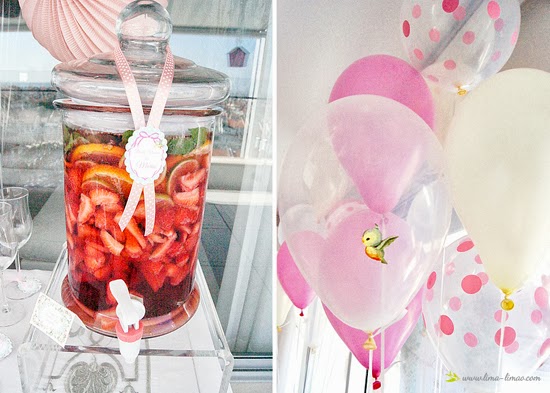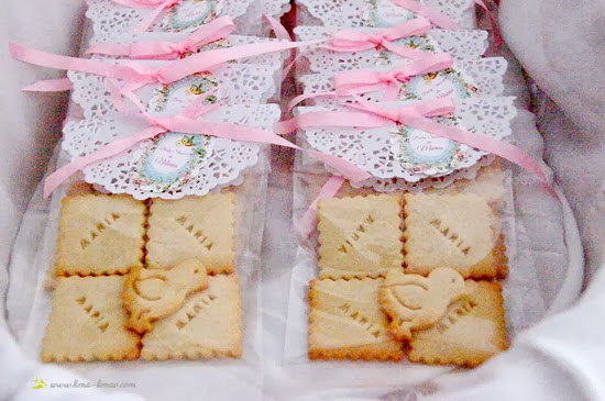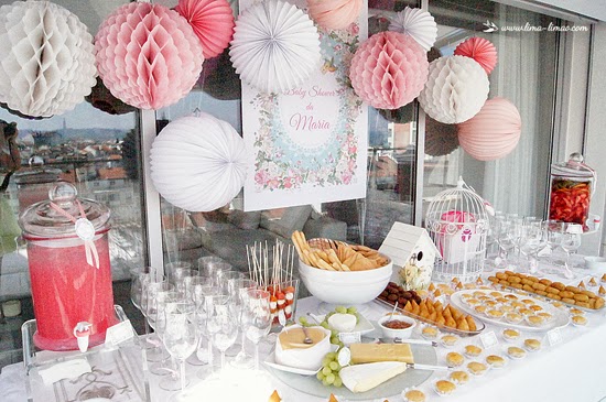 Thank you Liliani of Lima-Limao for sharing these unbelievably beautiful bird garden baby shower photos! The pink, white and aqua colors were used very well throughout especially on the centerpiece cake, the cupcakes, and the vase. I like how there was a little print of a colorful bird on the balloons. The clear white polka dot balloons look absolutely stunning. The flowers in a floral vase sitting next to two ceramic birds on top of floral baby blue and pink luggages really creates a romantic feel. I absolutely adore the vintage bird cage on the dessert table and also using baby bassinet as baby shower favors carrier! A satin pink ribbon and doilies were used to package the cookie favors. What a fantastic and adorable idea! There are so many inspiring elements to this romantic bird garden baby shower. You would be able to find some of the decorations and supplies used for this baby shower at her etsy shop especially the printables.