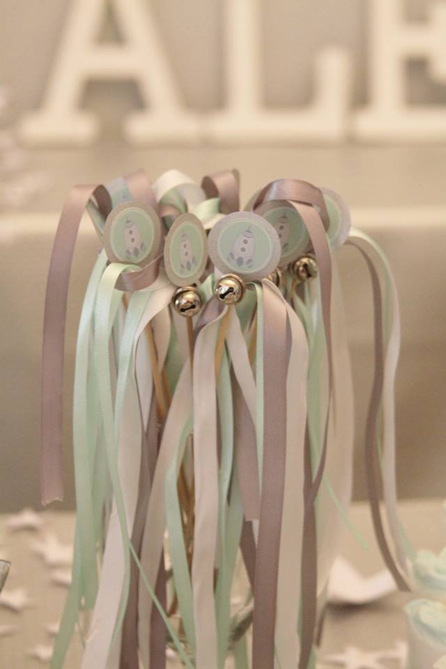 Wow!! This is the best word to describe the Baby Shower space shuttle theme for this baby shower display. This is really a nice theme for any parent that has a boy or a girl. Typically the space theme is for a boy but the simplicity and color scheme in this display makes it a very gender-neutral way. The wooden rocket surrounded by little baby diaper wrapped in a nice baby blue satin bow is such a great idea. I especially love the way the wooden display box is surrounded by tiny little stars. It really has a star effect with the crystal hanging tiers that are surrounding the space shuttle piece. The best part is the shooting stars that fall across the front of the display. The pattern on the display background and table really help bring out all the details in the display. I think the silver, pastel green, and white colors are befitting for a baby and the silver for the spaceship is wonderful.