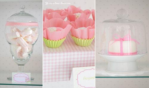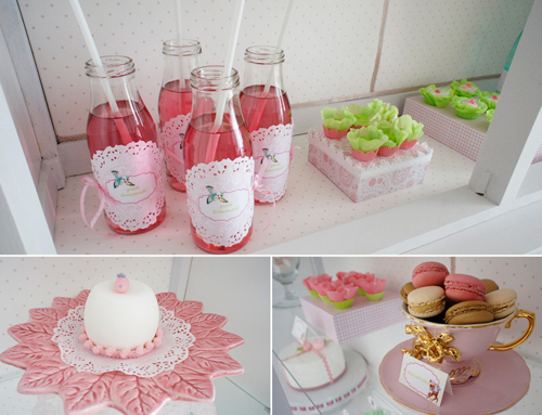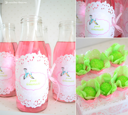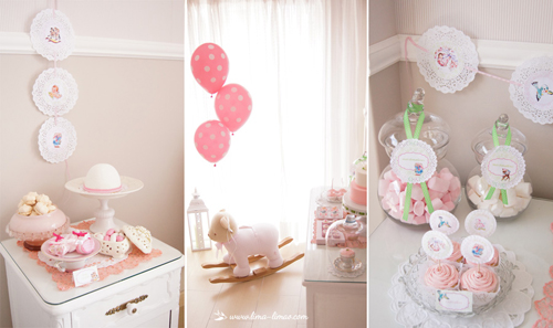 Thanks Liliani of Lima-Limao for letting me share these beautiful photos of vintage princess themed baby shower with color schemes of pastel pink and mint green. It has a bit of tea party feel as well which is so brilliant as it goes so well with the princess baby shower. I love doilies and she used lots of white doilies for this theme. Doilies for the cupcake wrappers, placements, drink bottle label, candy jar label, the bunting, It is almost a dreamlike room! There are so many details to the decorations so have a very close look at the photos! Liliani has etsy shop where she sells so many great decorating products including white doilies and hanging decorations.